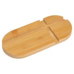 Eco-friendly bamboo tablet and smartphone holder, provides a safe hold for the desk or on the go. Your logo will be engraved on the holder.